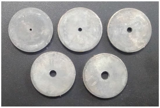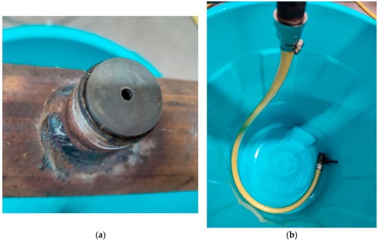 Pipeline defects are modeled using steel discs with holes of different diameters (from 1 to 5 mm). They are shown in Figure 4. The discs were mounted and clamped with a threaded fitting on a nipple welded to the pipe (Figure 5a). To eliminate noise from the impact of the water jet, a rubber hose was connected to the leak site, at the end of which a ball valve was located (Figure 5b).