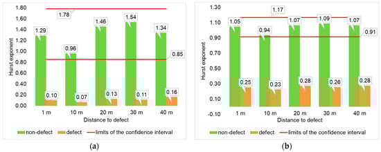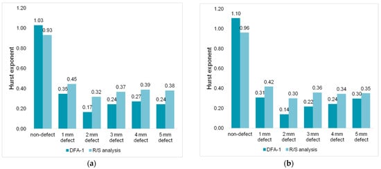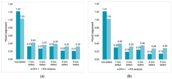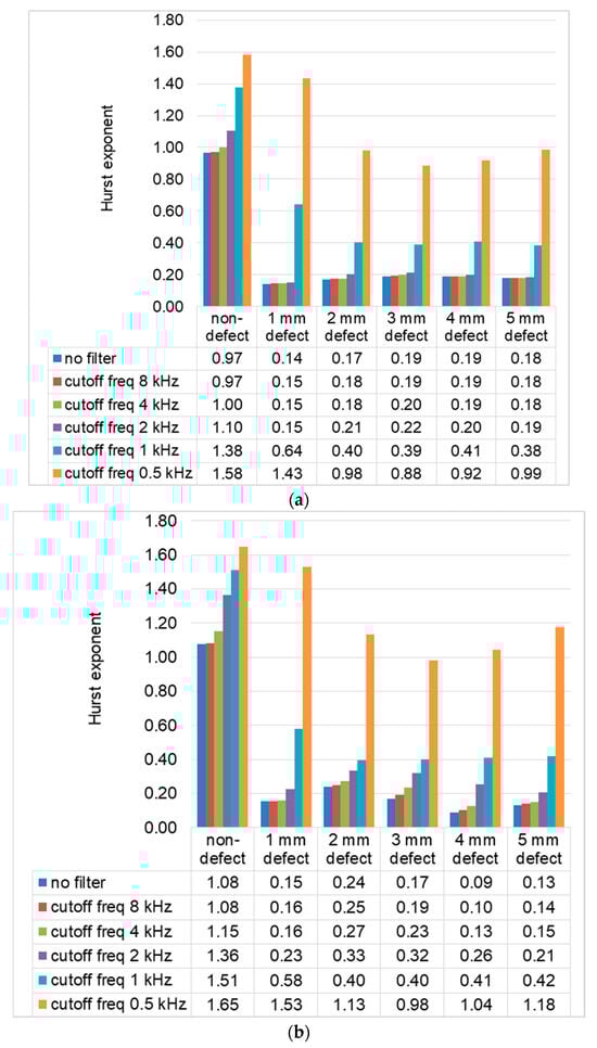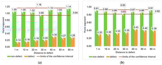 The results of the calculation of the Hurst exponent using the DFA-1 method at different filter cutoff frequencies: (a) for signals recorded in the longitudinal direction of the pipeline; (b) for signals recorded in the radial direction of the pipeline.