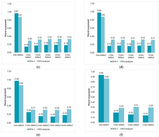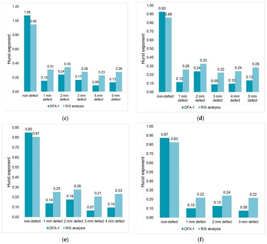 Hurst exponent of acoustic signals recorded in the radial direction of the pipeline at different pump discharge pressures: (a) 1.5 bar; (b) 2 bar; (c) 2.5 bar; (d) 3 bar; (e) 3.5 bar; (f) 4 bar.