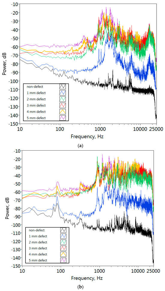 Power spectrum of acoustic signals: (a) recorded in the longitudinal direction of the pipeline; (b) the radial direction of the pipeline.