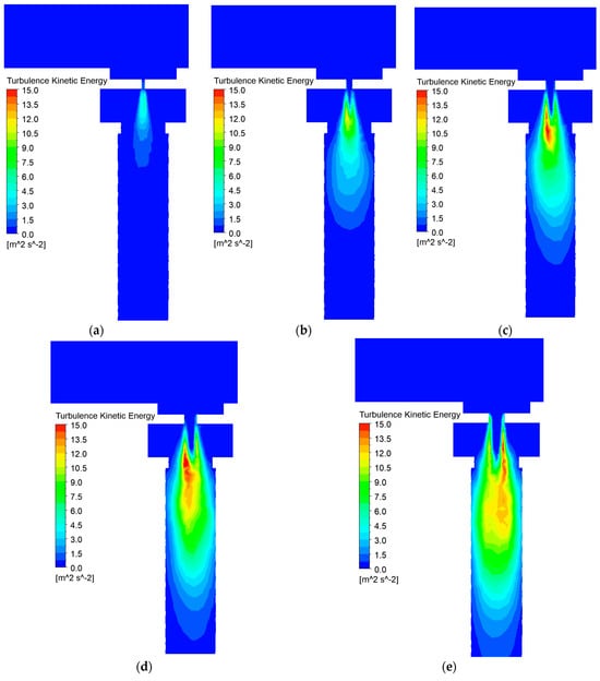 Turbulence kinetic energy at different defect diameters: (a) 1 mm; (b) 2 m; (c) 3 mm; (d) 4 mm; (e) 5 mm.