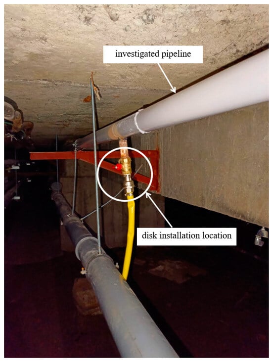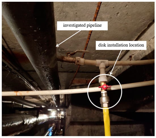 Experimental studies have been conducted on steel pipelines of the current water supply system. The experiments were carried out in the basements of two public buildings on pipelines of different passage diameters: 100 and 50 mm. To simulate a pipeline defect, a steel disc with a through hole with a diameter of 5 mm was used, as shown in Figure 3. The disc was mounted on a shut-off valve and clamped with a threaded fitting, water was drained through a rubber hose. In the case of a closed tap, the condition of the pipeline was considered defect-free; in the case of an open one, defective. A photo of the location of the defect model is shown in Figure 12 and Figure 13.