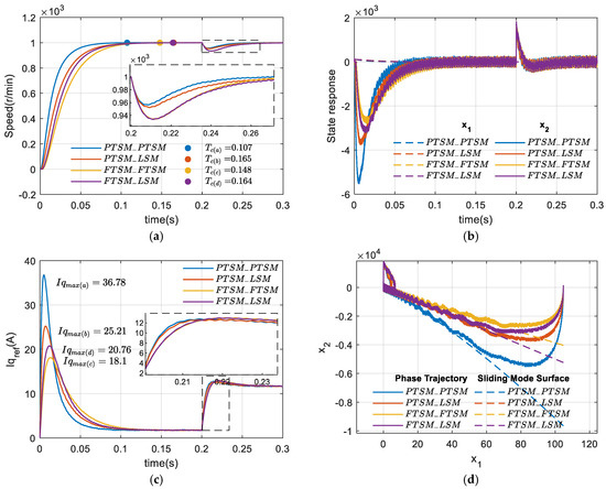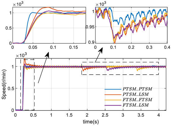 - In the step responses stage, the control law of the speed regulation system of PMSM based on PTSM-PTSM has a faster convergence time than the other three control methods and does not exhibit overshoot during the process of converging to the stable state.