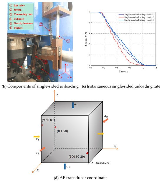 The above-described experimental set-up allowed us to simulate the stress state of the roadway surrounding rocks that changed from three-directional stresses acting on six faces to three-directional stresses on five faces due to sudden unloading. The stress-adjustment process of the shallow-lying element body in the roadway surrounding rocks was simulated. The unloading components are shown in Figure 2b.