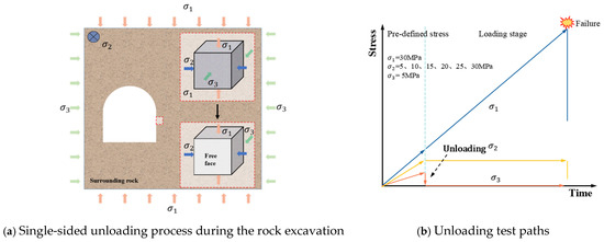 During roadway excavation, the surrounding rocks shifted from in situ stress to unloading. That is, from being subjected to three-directional stresses on six faces to three-directional stresses on five surfaces. The radial stress acting on the surrounding rocks decreased in this process while the tangential stress increased [14]. The surrounding rocks failed as the concentrated stress exceeded the rocks’ compressive strength (Figure 3a). The experimental load path for the true triaxial unloading tests was set up, as shown in Figure 3b, to simulate the transition of the stress state and analyze the law of influence of on unloading in the sandstone samples. The samples were first subjected to true triaxial stresses. The loading rates in the directions of and were 60 kN/min and 10 kN/min, respectively. would increase to the specified within 5 min. Therefore, at values of 5, 10, 15, 20, 25, and 30 MPa, the loading rates were 10, 20, 30, 40, 50, and 60 kN/min, respectively. With the being constant, single-sided unloading was implemented instantaneously at . Then, the was continuously increased at a 60 kN/min loading rate until rock failure.