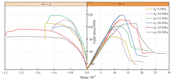 As the stress varied, the rocks’ strength and deformation characteristics under unloading differed significantly. We further analyzed the influence of single-sided unloading on the rocks’ mechanical characteristics at different values by plotting the stress–strain curves for the samples at different values under unloading, as shown in Figure 4.
