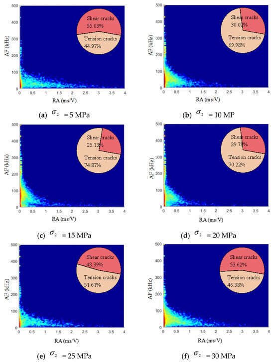 The RA-AF density cloud maps were plotted for the crack penetration process in rocks under unloading at different values, as shown in Figure 6. The data points were denser as the color changed from red to blue. The data points were distributed over a larger area in regions with low RA and high AF. They were sparser and more dispersed in regions with high RA and low AF. Thus, the RA-AF density cloud map contained a triangular region. With at 5 MPa, the number of tension cracks did not differ significantly from that of the shear cracks, with the latter being greater in number than the former by 10.06%. Although the tension cracks were more distinct macroscopically, shear failure was predominant on the microscopic scale during crack development and propagation. As a tension fracture surface was formed macroscopically, shear friction was caused by differences in the vertical deformation on the two sides of the failure planes.