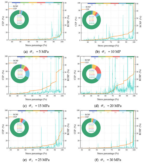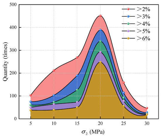 The quantity of RCRP between 2% and 6% was estimated to quantify the degree of damage dispersion, as shown in Figure 9. Under the same percentage, the higher the quantity of RCRP being counted, the higher the degree of crack propagation or communication. As increased, the quantity of RCRP being above 2% to 6% first increased and then decreased, with the inflexion point occurring at = 20 MPa. The above results revealed that the number of rock failure events within the specified area first increased and then decreased, as increased. The failure distribution was initially concentrated, then dispersed, and became concentrated again at the end.