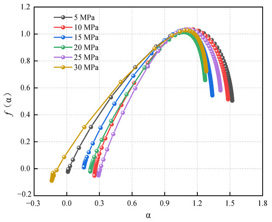 The multifractal spectra of the ring-down count were obtained at values from unloading to rock failure, as shown in Figure 10. The multifractal spectra at different values shared similar shapes. Function first increased and then decreased as grew.