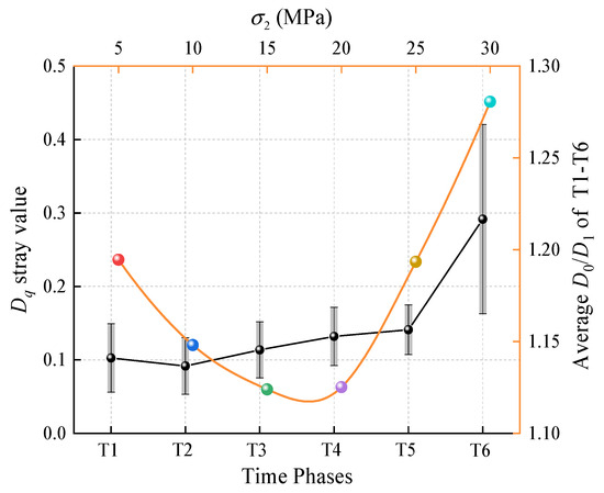 The capacity dimension and the information dimension represented the slopes at at q values of 0 and 1, respectively. The average values of from T1 to T6 were used to characterize the uniformity of the ring-down count distribution in the time domain. The closer the value to 1, the more uniform the distribution and the weaker the fractal features would be. was extracted at different , and the comparison is shown in Figure 12. It can be found that as increased, first decreased and then increased. The non-uniformity of the ring-down count distribution in the time domain first decreased and then increased. Small crack propagation was predominant at a lower , while sudden, large cracks were predominant at a higher . The failure distribution displayed a higher level of non-uniformity.