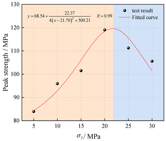 Other studies have not yet reported an initial increasing trend of the peak strength of rocks, followed by a decrease at a later time, in the presence of an intermediate principal stress based on experimental findings [4,6,7,14]. Nevertheless, our results agree with those of Lu [35] and Song [36]. Analyzing the variation curve of the peak strength of rocks provides informative guidance for real-world applications. In the present study, the Lorentz function had a high goodness-of-fit for non-linear and convergent data. The data analysis is shown in Figure 13, and the peak strength was well correlated with in the rocks under unloading. It can be observed from the fitted curve that the inflection point in the peak strength of the rocks under unloading was about 21.82 MPa. We could roughly estimate the peak bearing capacity of the rocks within a certain range at different under unloading. It is noteworthy that according to previous studies, is about 21.5 MPa when the burial depth of the roadway is 1200 m. Therefore, the inflection point for the influence of on the roadway may occur at a burial depth of about 1200 m. This finding sheds some light on engineering design and highlights need to enhance the bearing capacity of the surrounding rocks by appropriately increasing . It is also necessary to prevent higher levels of fragmentation and energy release due to an increased .