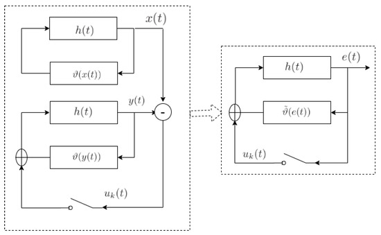 , the error system from Equations (1) and (2) can be studied with Figure 1. We can also see that there exist a transient process when the control input is an intermittent signal and Equation (4) cannot be directly drawn from Equations (1) and (2).