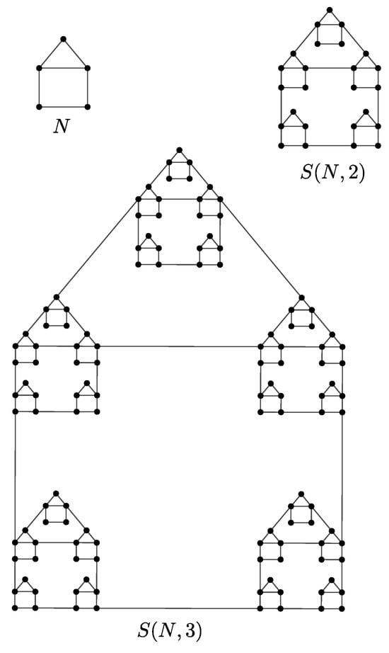 Sierpiński gasket is a classic fractal structure []. Graphs of “Sierpiński type” are of significant importance across various fields of mathematics and also in several other scientific areas. In 1997, Klavžar and Milutinović [] introduced the graphs