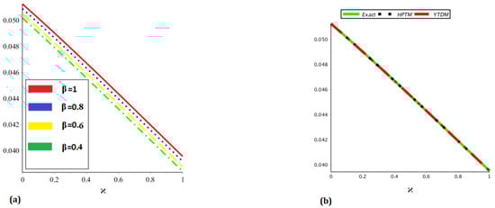 Analytical solution behavior of at (a) different values of , and (b) a comparison among accurate and analytical solutions.