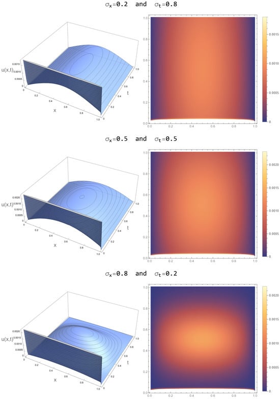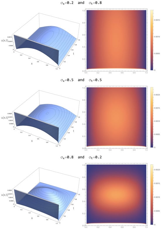 In the first row, the Gaussian forcing parameters are set to and , meaning the spatial influence of the forcing is relatively localized while its temporal effect persists over a longer period. The 3D surface plot on the left shows a smooth and elongated spread across time, with a gradual decrease in the solution’s values as we move away from the center of the domain. This indicates that the external factor, perhaps reflecting a long-term intervention such as a lockdown, has a sustained impact over time but is spatially restricted. The density plot on the right confirms this, with a more concentrated region of influence in the center of the domain, while the effects taper off near the boundaries. This combination suggests that while the intervention or outbreak is spatially confined, it significantly affects the system over an extended period, modeling scenarios where long-term but localized measures are implemented.