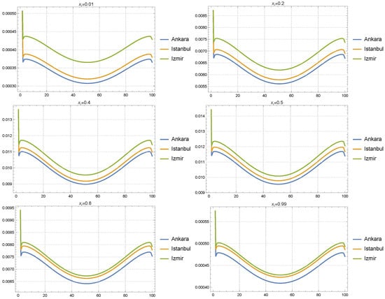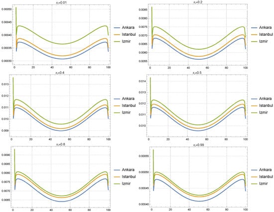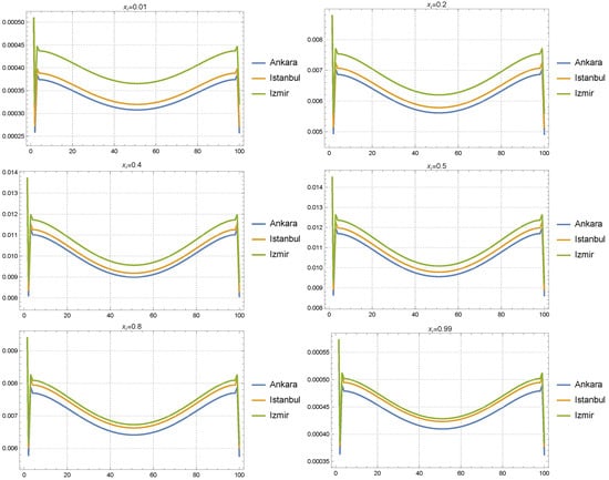 At the intermediate points and , the solutions for all three cities become more synchronized. The oscillatory behavior still persists, but the differences between the cities are less pronounced compared to the boundary points. The broader spatial spread of is more evenly distributed across the domain at these points, allowing the solutions to converge more closely in their frequency behavior. Izmir continues to show slightly higher oscillations, reflecting a greater sensitivity to the forcing parameters, but the differences are not as significant as at the boundaries. This indicates that the mid-domain points are less influenced by localized effects and more by the global impact of the forcing.