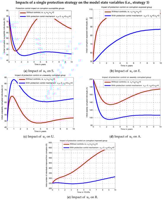 The effect of the strategy (i.e., ,, and ) known as the corruption prevention mechanism, by setting , is examined in this subsection through numerical simulations where protection or improvement control strategies were not applied and when the corruption diffusion prevention strategy (strategy 1) was applied. Figure 2a–e each display a graphical interpretation that illustrates how the preventative method affects the dynamics of corruption diffusion. All susceptible, exposed, unaware corrupted, aware corrupted, and enhanced persons are drastically reduced when the protection control strategy is used, in contrast to the simulation scenario in which no control strategies were used.