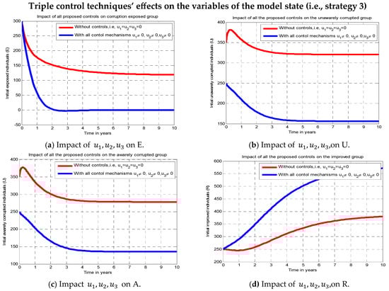 In this subsection, we conduct numerical simulations both with and without the implementation of all suggested regulating techniques and (strategy 3) at the same time. We can examine the impacts of various control tactics on the system dynamic variables corruption status based on the results shown in Figure 4. All of the suggested controlling strategies have a significant result in reducing the exposed people by simulating without implementing all of the suggested control strategies, and by implementing any other control strategies, as shown in Figure 4a. Figure 4b illustrates the impact of putting all of the suggested controlling strategies into practice using the number of people who are unaware of corruption. This has a significant result in reducing people who are unaware and corrupted in comparison to the numbers shown in Figure 2c and Figure 3b, respectively. As compared to the corrupted people depicted in Figure 2d and Figure 3c, respectively, Figure 4c illustrates the impact of all suggested controlling strategies on the number of aware corrupted individuals and significantly reduces that number. In contrast to the number of repented persons depicted in Figure 2e and Figure 3d, respectively, Figure 4d illustrates the influence of all suggested control activities on the repented (improved) individuals and significantly increases repented people. Lastly, we can see from Figure 4 that, after ten years, corrupted people in the population significantly decline if all potential regulating activities and i.e., using strategy 3) are put into practice. Additionally, this approach is the most successful in reducing and controlling the dynamics of corruption dissemination in the population when compared to other approaches.