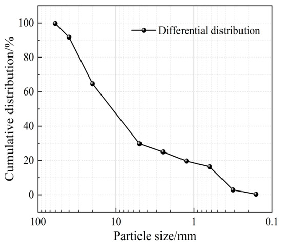 The aggregates used in the experiment were taken from the riverbed gravel soil at a construction site in Linzhou City, Henan Province China, with a sampling depth of approximately 2 m. The soil sample type is silty gravel, containing about 58% gravel and 16% fine-grained soil, with a few particles exceeding 60 mm in diameter. The aggregate particle gradation curve is shown in Figure 1, and the proportion of different particle sizes is shown in Table 1. Test results indicate that the mud content of the material reaches 23.56%, which far exceeds the requirement in the technical guideline for cemented granular material dams stating that “the mud content in cemented sand and gravel should not exceed 5%”.