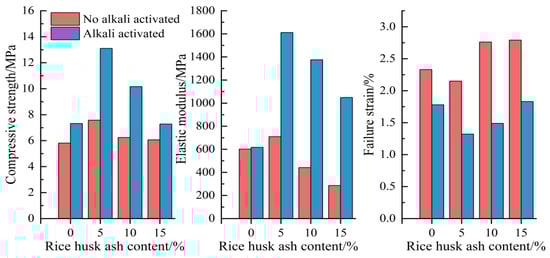 The stress–strain curves of alkali-activated RHA (CSG) samples are shown in Figure 3. As shown in Figure 3, the stress–strain curves of CSG samples with different mix ratios exhibit similar variation trends. The stress–strain curves can be generally divided into four stages: compaction stage, elastic stage, plastic stage, and failure stage. In the compaction stage, stress increases slowly as the internal pores of the samples are gradually compacted. In the elastic stage, the stress–strain curve is almost like a straight line, and the stress growth rate is relatively fast. During the plastic stage, stress increases slowly, and slight cracks begin to appear on the surface of the samples. When the stress reaches its peak value, the samples enter the failure stage, where noticeable cracks develop inside the samples, and stress rapidly decreases, exhibiting strain-softening characteristics. Taking the stress–strain curve with 5% RHA content as an example, without alkali activators, the slope of the elastic stage in the stress–strain curve increases compared to the control group without RHA addition, and the peak stress in the stress–strain curve rises. Under the action of alkali activators, the slope of the elastic stage of the stress–strain curve further increases, the stress growth rate accelerates, the peak stress significantly increases, and the overall brittleness of the material is increased. The specific experimental data are shown in Figure 4.
