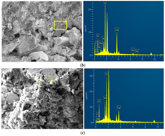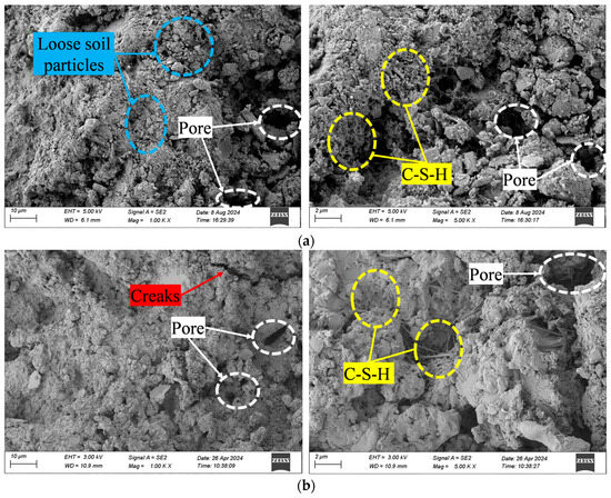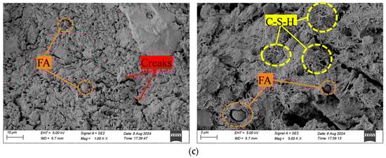Due to the extensive number of SEM images, this paper only selects one control sample (CSG-R0) and the two samples with the best performance (CSG-R5 and CSG-AR5) for comparative analysis. Figure 6 shows the micro-morphology of CSG materials. As seen in Figure 6, the surface of CSG-R0 samples contains a large number of loose soil particles, with the framework particles being predominantly single grains. Some particles are connected by a small amount of reticulated cementing substances (C-S-H), while obvious voids exist between most aggregate particles, and the initial internal micro-cracks are noticeable. With the addition of RHA, on the one hand, the powdered RHA fills the pores as fine particles, enhancing the compactness of the material. On the other hand, RHA is rich in large amounts of active SiO2, which generates cementitious substances that connect the pores, resulting in solidified soil particles, exhibiting a certain clustering effect, reducing the number and width of initial micro-cracks within the material, and improving the microstructure of the material [37]. With the addition of alkali activators, an alkaline environment is created to enhance the pozzolanic activity of RHA and fly ash, promoting the generation of acicular and reticular cementitious substances. These amorphous, gel-like materials cover the surfaces of the original particles and form a dense network structure, further enhancing the material’s compactness and reducing the number of internal micro-cracks. This indicates that the incorporation of alkali activators significantly improves the microstructure of CSG materials.