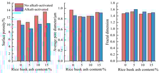 Figure 8 shows the pore characteristic parameters of CSG materials under different mix ratios. As can be seen from Figure 8, with the increase in RHA content, the surface porosity and average pore diameter first decrease and then increase, while the fractal dimension first increases and then decreases. On the one hand, RHA acts as fine particles that fill the pores; on the other hand, an appropriate amount of RHA undergoes pozzolanic reactions to generate cementitious substances, enhancing the overall compactness and complexity of the structure and forcing larger pores to transition into smaller ones. However, excessive addition of RHA leads to the incomplete hydration of some RHA particles, adversely affecting the generation of cementitious substances and negatively impacting the internal structure of the material, causing an increase in surface porosity and average pore diameter, while the fractal dimension decreases. With the addition of alkali activators, surface porosity and average pore diameter show a decreasing trend, while the fractal dimension shows an overall increasing trend. At 5% RHA content, the values of surface porosity and average pore diameter are the smallest, and the fractal dimension reaches its maximum value. The specific images and processed data of the fractal dimension are shown in Figure 9 and Figure 10, and Table 6, respectively.