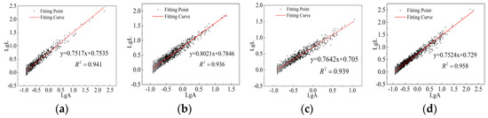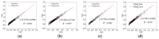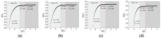 Fractal dimension of pore volume of CSG specimens without alkali activation. (a) 0%RHA. (b) 5%RHA. (c) 10%RHA. (d) 15%RHA.