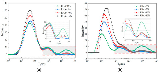 Nuclear magnetic resonance technology can analyze the pore distribution patterns of materials without causing damage. The T2 spectrum obtained from NMR experiments can effectively reflect the internal pore characteristics of CSG specimens. Figure 11a shows the T2 spectrum curves of CSG materials with different contents of RHA. As can be seen from Figure 11a, the T2 spectrum curve of CSG materials presents a three-peak distribution, with the first peak having a larger area. With the addition of RHA, the area of the first peak shows an increasing trend, while the area of the third peak significantly decreases. This indicates that the internal pores of the CSG samples can be roughly classified into three categories—micropores, capillary pores, and macropores—where micropores and capillary pores occupy higher proportions, while macropores occupy smaller proportions. Figure 11b presents the T2 spectrum curves of CSG materials with different contents of RHA under alkali activation. As can be seen from Figure 11b, with the addition of alkali activators, the overall shape of the T2 spectrum curve of the CSG samples remains unchanged and still exhibits a three-peak distribution. However, the first peak shifts to the right. The reason is that under the action of alkali activators, RHA reacts to generate additional cementitious substances, which may alter the original pore distribution within the material [41].
