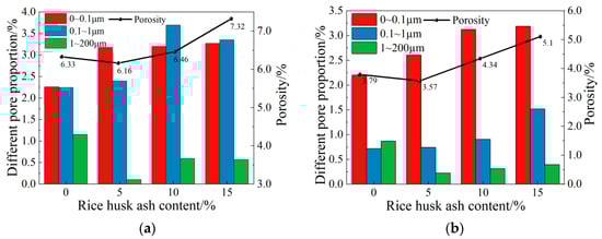 Figure 12a shows the pore proportions of CSG materials under different RHA contents. As can be seen from Figure 12a, with the increase in RHA content, the proportions of micropores and capillary pores show an overall upward trend, while the proportion of macropores and porosity first decreases and then increases. The reason is that a small amount of RHA is added to improve the pore structure, but when an excessive amount of RHA is added, it adheres to the surface of the aggregates without reacting, absorbing a large amount of water and inhibiting the progress of early hydration reactions. This, in turn, increases the local water–cement ratio of the particles within the material, resulting in an increase in the proportion of macropores and porosity [42]. Figure 12b presents the pore proportions of CSG materials with different contents of RHA under alkali activation. As shown in Figure 12b, with the addition of alkali activators, the proportions of micropores and macropores fluctuate slightly, while the proportions of capillary pores and porosity significantly decrease. This indicates that the addition of alkali activators promotes the generation of cementitious substances, with a more pronounced effect on improving capillary pores.
