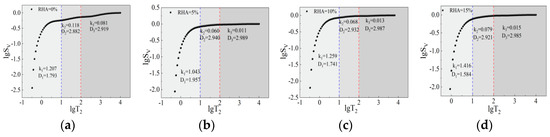 Fractal dimensions of CSG samples under alkali activation. (a) 0%RHA. (b) 5%RHA. (c) 10%RHA. (d) 15%RHA.