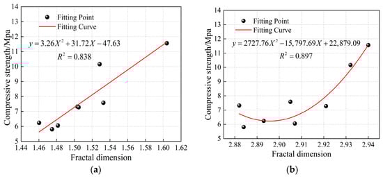Fitting curves of compressive strength of CSG specimens based on different types of fractal dimension. (a) SEM fractal dimension. (b) NMR fractal dimension.