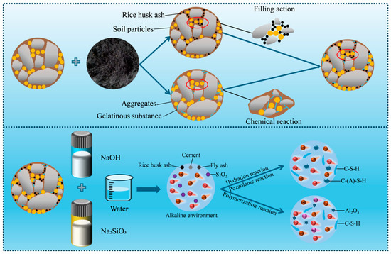 Figure 17 shows the solidification mechanism of alkali-activated RHA CSG materials. As shown in Figure 17, the CSG samples contain a small amount of cementitious materials and high porosity. After incorporating RHA, the powdered RHA can fill the capillary pores and macropores between coarse aggregates and soil particles, thereby reducing porosity and enhancing the compactness of the CSG materials. Additionally, the interface friction between RHA, soil particles, and cement is also increased.