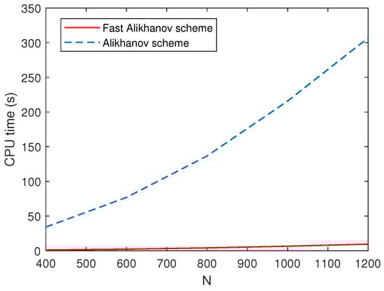 Figure 3. It is clear that the fast Alikhanov scheme saves a lot of computational costs compared to the Alikhanov scheme.