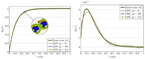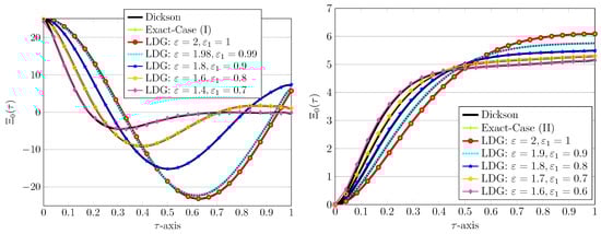 The numerical solutions for Case (I) (left panel) and Case (II) (right panel) illustrate the impact of fractional orders ( and ) on system dynamics. In Case (I), as (which is a near integer order), the solutions aligned with classical second-order RLC circuit behavior (e.g., smooth oscillations), while smaller values () exhibited fractional damping with accelerated decay or memory effects. For Case (II), the solutions transitioned from first-order exponential relaxation () to anomalous transport with slower decay (), highlighting fractional diffusion dominance. The LDG method () resolves these behaviors robustly, maintaining high accuracy, even with coarse discretization (), and suppressing oscillations via upwind fluxes. This underscores the method’s efficiency in capturing both classical and fractional regimes, making it ideal for engineering applications, like circuit modeling.