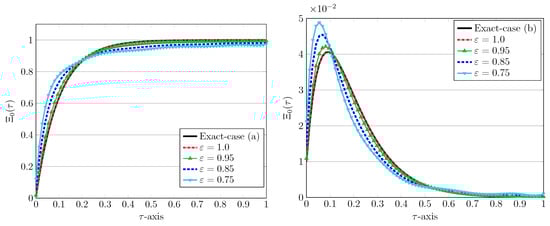 . We investigated a fractional-order RLC model, which is illustrated by the following differential equation [29,30,31,32]:where , , and . The initial conditions are specified as for .For the integer-order case (, ), we define , , and . We analyzed two scenarios under :