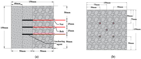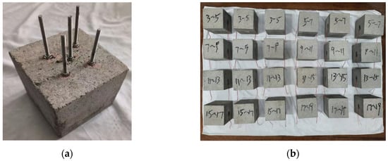 The preparation of bolted specimens followed a procedure similar to that of unbolted specimens. The process began by pouring the cementitious binder into the mold to a depth of 40 mm. Five HRB400 rebars (Manufacturer: Shagang Group, Zhangjiagang City, Jiangsu Province, China) (6 mm in diameter) were then fixed at predetermined positions onto the slurry surface. Additional binder was poured until the mold was half-filled, followed by vibration compaction. After partial curing, the rebars were temporarily extracted, and anchoring agents were injected into the boreholes. The rebars were reinserted in an end-anchored configuration. Subsequently, 500 g of coal gangue grains (pre-screened to the designated size range) were thoroughly mixed with the binder and poured to fill the remaining mold space. Vibration compaction and surface leveling were performed, followed by the same post-processing steps as for unbolted specimens. Following curing completion, epoxy resin-based anchoring adhesive was selected as the grouting material. With an anchorage length of 8 cm, the specimens were fabricated with installed bolts, cured for 24 h, and subsequently subjected to a pre-tightening force of 0.5 kN applied via a torque wrench after complete hardening. The final specimens are illustrated in Figure 3.