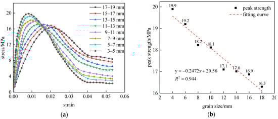 (a) The stress–strain curve of an unbolted composite rock mass specimen. (b) The peak strength of unbolted composite rock masses under different grain sizes.