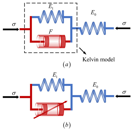 Under long-term sustained loads, the skeleton of soft soils undergoes time-dependent deformation that integrates both elastic and viscous characteristics. To describe these mechanical behaviors, the component models, which combine features of Hooke’s elastomer and Newtonian viscous body, are commonly employed in classical viscoelasticity. The widely used Merchant model, as shown in Figure 1a, consists of a Hooke’s elastomer with elastic modulus and a Kelvin element in series, and each Kelvin model is made up of a Newtonian viscous body with viscosity coefficient in parallel with a Hooke’s elastomer with elastic modulus .