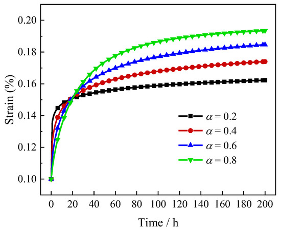 The effect of the fractional order on creep behavior is illustrated in Figure 2. The parameters adopted are: , , , and . It is found that creep strain increases with the fractional order , showing the dependence of creep strain on the fractional order.