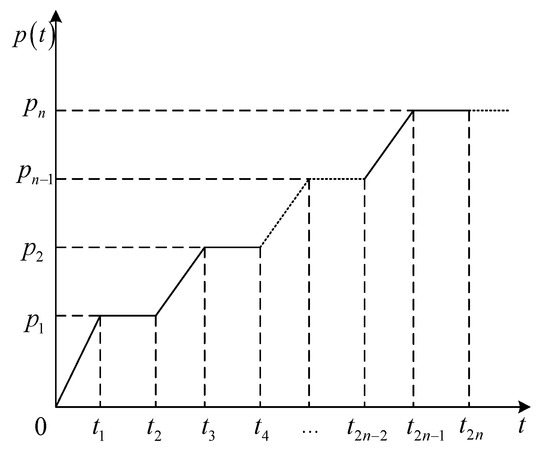 Let the entire loading process be discretized as . Within any typical time interval, , the consolidation stress is applied at a steady rate over the time interval, , from the value at the end of the previous step to the targeted value, and then maintains a constant over the time interval, . Under this definition, the loading function can be written as follows: