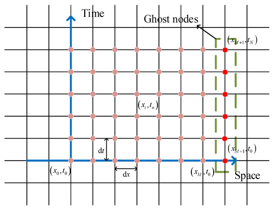 To derive the finite difference format of Equation (18), a grid of points needs to be firstly defined in the plane. Let and be two positive integers defining the number of equally spaced points in the spatial and temporal domains, respectively. The intervals of length in the spatial and temporal directions are represented by and , as shown in Figure 6. With this definition, () and ().