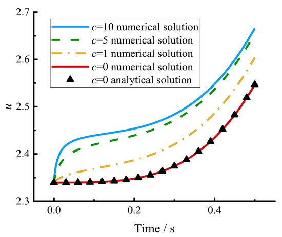 For comparison, Equation (18) needs to be degraded by letting , , , and . The evolution of with respect to are plotted against time in Figure 7. As seen, the solutions given by the proposed numerical procedure agree well with the analytical one when .