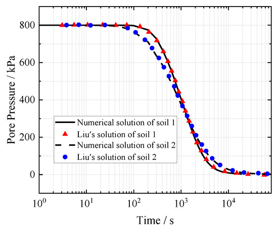 In addition, when we let , , and , Equation (18) degrades to a 1D fractional consolidation model, whose mechanical behavior of the soil skeleton is governed by the fractional Kelvin model, and water flow is controlled by classical Darcy’s law. Liu and Yang [30] have obtained a semi-analytical solution of this problem by using the Laplace transform and the numerical inverse Laplace transform method. The parameters of two soil samples are given in Table 1, and the results are shown in Figure 8. It is found that the results given in the literature and this paper are also consistent.