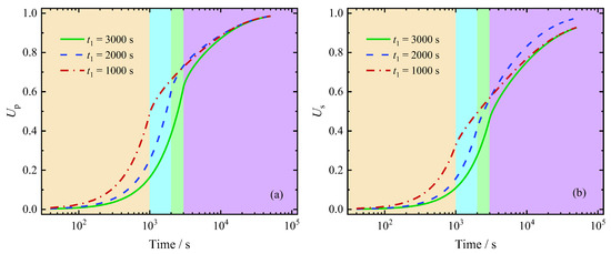 Conversely, Figure 10b shows that a decrease in leads to an increase in in the early loading stage (before 100 s), after which the trend reverses and becomes more pronounced over time. This characteristic has been discussed in the literature [32,33]. They attributed the intersecting phenomenon to the complexity of the fractional derivative-based component model. Overall, this phenomenon appears to be independent of the loading form and is closely related to the consolidation stage.