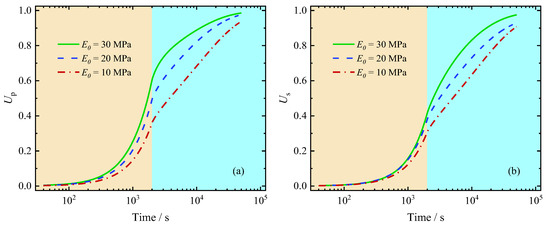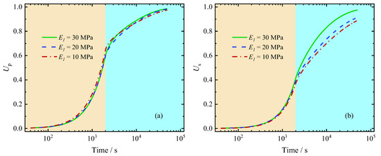 Influence of elastic modulus on average degree of consolidation: (a) Up (b) Us.