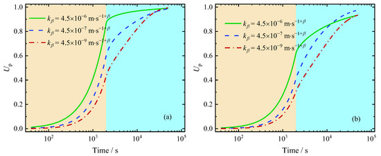 The parameter reflects the degree of change in pore structure. A higher fractional order results in a more significant reduction in the permeability of the soil, which slows the rate of , as shown in Figure 14a. However, in the final consolidation stage, this trend reverses. This occurs because the residual excess pore pressure is minimal at the end of the consolidation process, and the hydraulic gradient is significantly reduced. As a result, the dissipation of excess pore pressure slows down, leading to a decrease in the rate of .