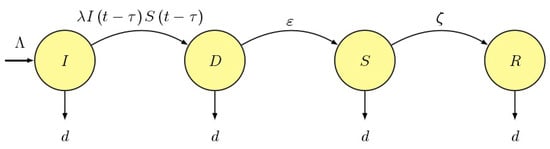 Proof. When , Equation (7) can be simplified to , where are the roots of Equation (7). When assumptions and hold, according to the Routh–Hurwitz stability criterion, all roots of Equation (7) have negative real parts. By Lemma 2, the positive equilibrium point of system (2) is locally asymptotically stable.