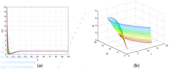 Figure 3a, it is shown that, upon the introduction of the time delay parameter, system (2) requires a significantly longer period to attain a steady state and demonstrates frequent oscillations prior to stabilization. Both