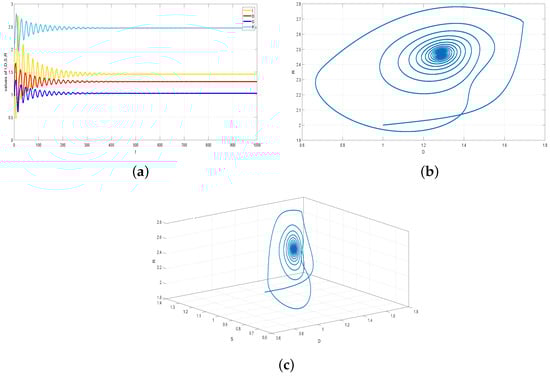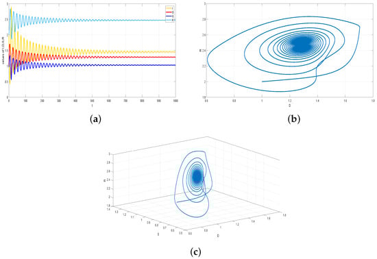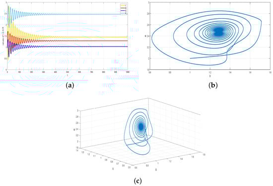 This section is dedicated to investigating the stability and bifurcation behavior of system (2) across diverse fractional orders, with the objective of validating the conclusions reached previously. Firstly, when we set , system (2) can be considered as an integer-order model. Meanwhile, the impact of incorporating the time delay parameter into system (2) is investigated.