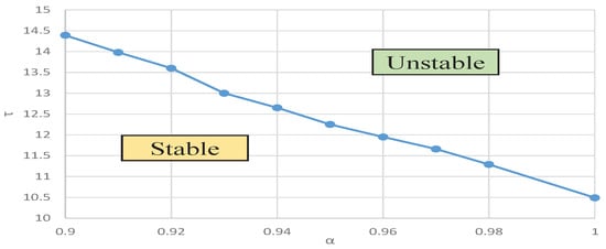 Remark 1. By summarizing the four examples presented above, the bifurcation values corresponding to different fractional orders were computed, and Figure 11 was generated. As the fractional order continuously increases, the critical bifurcation value at time delays gradually decreases, remarkably reducing the stable region. Remark 2. Based on the numerical simulations presented above, it can be inferred that the bifurcation parameter of system (2) is . The system becomes unstable when , while it maintains stability when . Moreover, a lower order of system (2) is associated with a larger bifurcation parameter , suggesting that the stability region of the system gradually broadens as its order decreases.